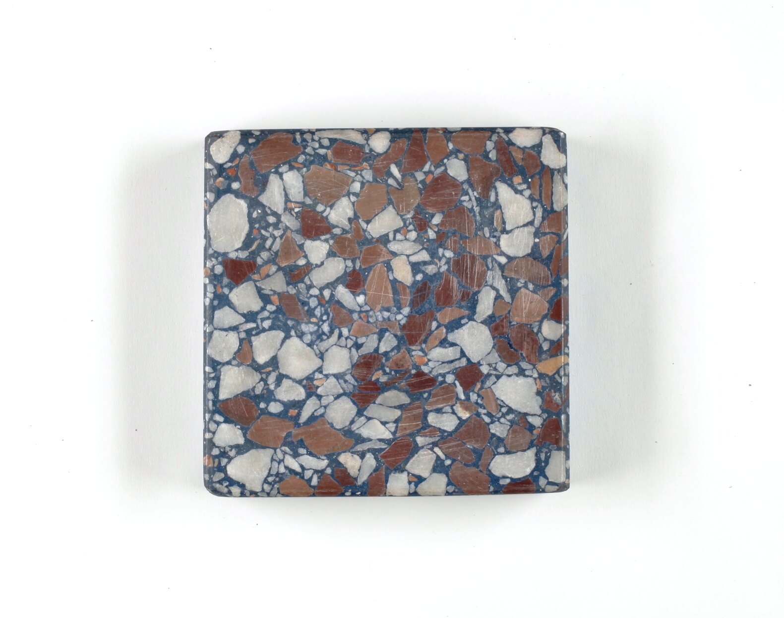 Square shaped terrazzo sample with blue base and coloured aggregate in reddish brown and white. White aggregate appears in both small and large pieces and reddish brown aggregate predominantly large with some smaller pieces. Some yellow and orange aggregate is also present. Sample has bevelled edges and surface scratches are visible on front face.