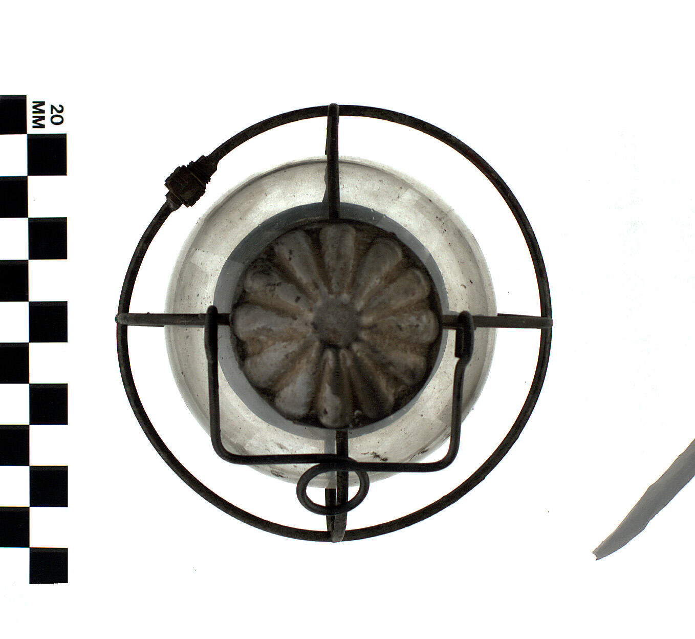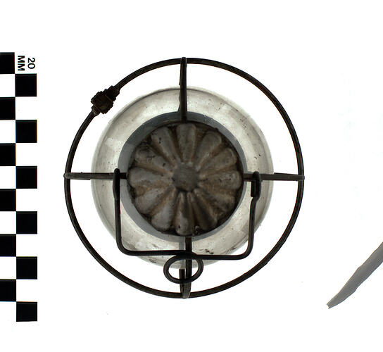 Metal and glass ship's lamp with a metal handle. The lamp has a grey coloured metal base on top of which sits a spherical glass cover, over the wick and where the flame would burn. There are five bars of metal which sit around and above the glass to protect it from breaking.