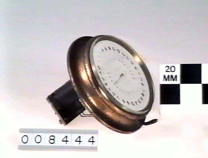 Circular instrument with a brass case and a white dial. Dial is marked with the letters of the alphabet around its periphery. Inside the ring of letters is ring of numbers. A pointer pivoted in the centre of the dial can move to indicate a particular letter or number. The pointer is mounted on a wire coil which can rotate between the poles of a magnet mounted on the back of the instrument. The instrument would normally have been set into the sloping front of a wooden base.