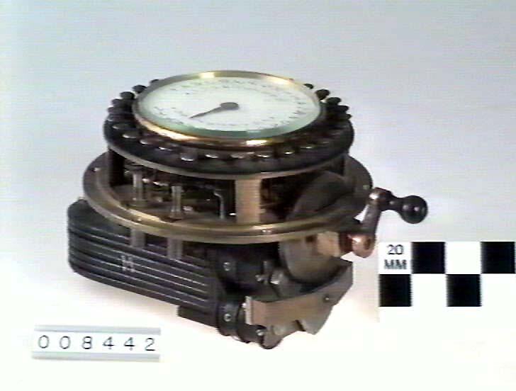 Circular instrument with a brass case and a white dial. Dial is marked with the letters of the alphabet around its periphery. Inside the ring of letters is ring of numbers. A pointer pivoted in the centre of the dial can move to indicate a particular letter or number. The pointer is mounted on a wire coil which can rotate between the poles of a magnet mounted on the back of the instrument. Outside the periphery of the instrument and opposite each letter is a small circular brass key which can be depressed as required. A crank handle projects from the below the instrument. The handle is connected to another moving coil moving between the poles of a set of magnets. The whole instrument would normally have been set into a wooden case, with the dial oriented horizontally and the crank handle projecting from the front of the case. This object includes a wooden case but it is not known if the case is the original one for this communicator.