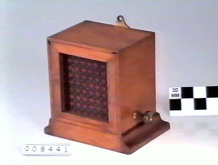 Clockwork mechanism and bell in wooden case. Wooden moulding around back and sides of base of case. Front of case open but fitted with patterned metal grille and fabric screen. One brass screw terminal on each side of case.