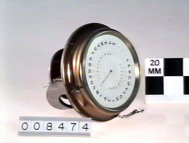 Circular instrument with a brass case and a white dial. Dial is marked with the letters of the alphabet around its periphery. Inside the ring of letters is ring of numbers. A pointer pivoted in the centre of the dial can move to indicate a particular letter or number. The pointer is mounted on a wire coil which can rotate between the poles of a magnet mounted on the back of the instrument. The instrument would normally have been set into the sloping front of a wooden base.