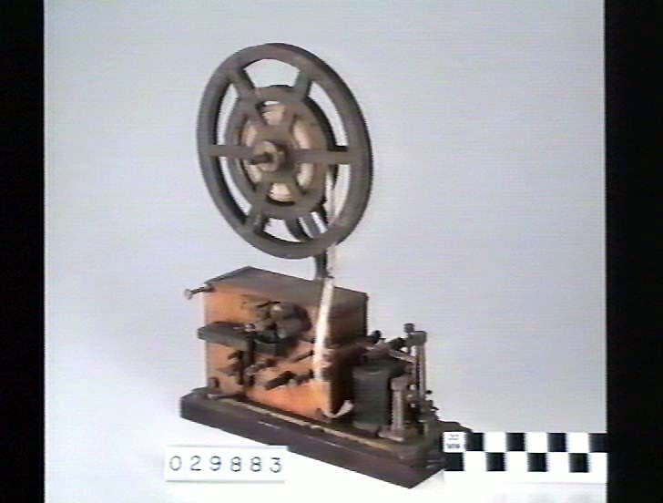 Object consists of a metal base at one end of which are two vertical wire coils forming electromagnets which are energised by the electrical signal received over the telegraph line. The rest of the base is occupied by a brass case housing the mechanism by which paper tape is moved past a small wheel at the end of a pivoted arm which moves in response to the electromagnets. The wheel is partially immersed in ink held in a small rectangular container, so that when the wheel is in contact with the tape, ink is carried on to the tape as the wheel rotates. The tape is supplied from a reel mounted above the register on a metal arm. The mechanism to move the tape is powered by a spring within the brass case which can be wound up using a key on a central square shaft.
