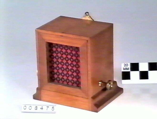 Clockwork mechanism and bell in wooden case. Wooden moulding around back and sides of base of case. Front of case open but fitted with patterned metal grille and fabric screen. One brass screw terminal on each side of case.