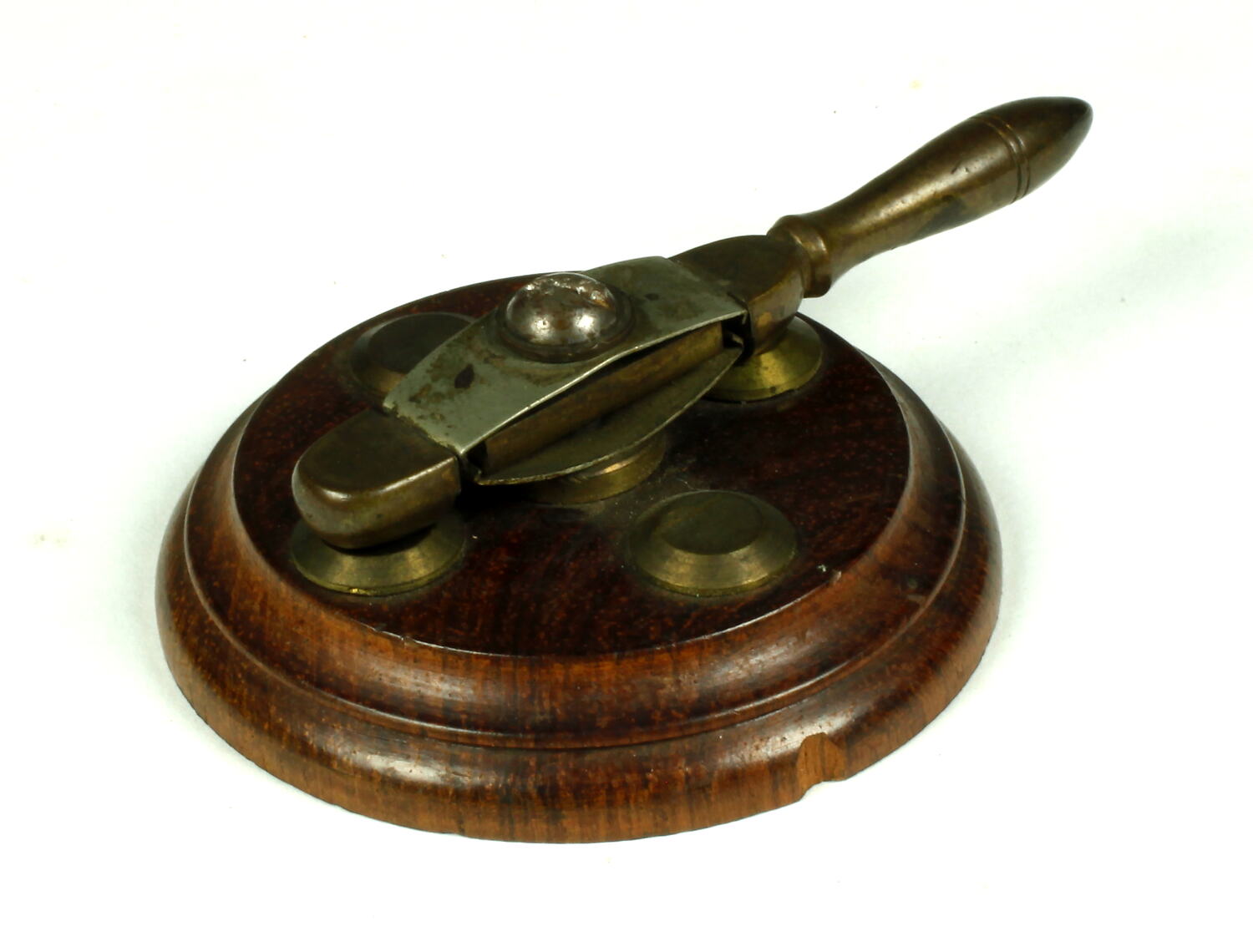 Circular wooden base with four embedded metal contacts. Centrally pivoted metal lever with wooden handle.