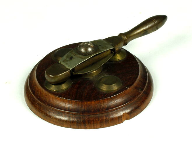 Telegraph switch used for making or breaking connections in one or two telegraph circuits. By rotating the centrally pivoted lever connection could be made between either of two pairs of metal contacts. With the handle in an intermediate position, all connections were broken.