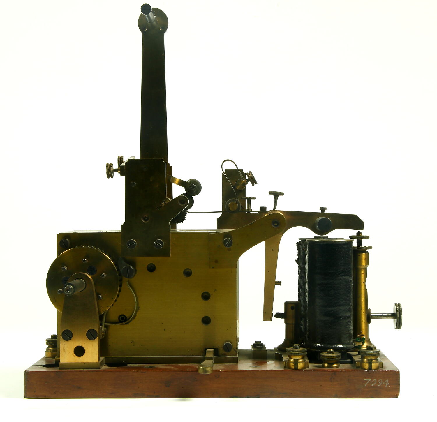 Wooden baseboard. Two vertical coils at one end of baseboard. Gear mechanism enclosed in brass case with inking mechanism mounted above case. Arm with spindle to hold reel of paper tape attached to side of brass case. Various terminals for wire connections.