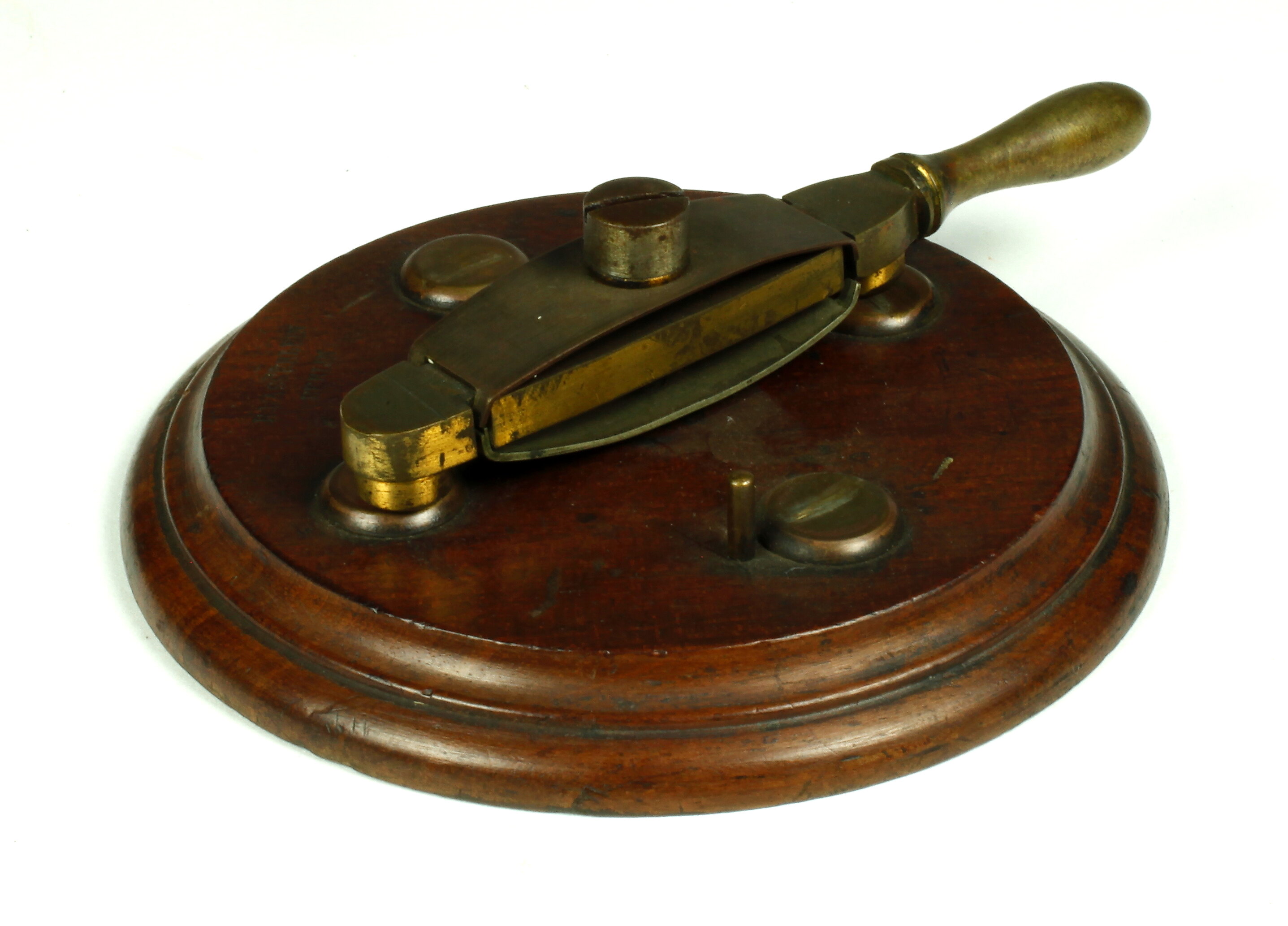 Circular wooden base with four embedded metal contacts. Centrally pivoted metal lever with wooden handle.