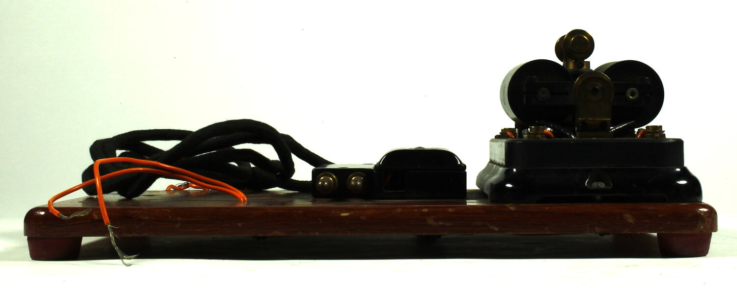 Wooden baseboard. Relay with two horizontal coils on Bakelite baseplate fitted to on end of a wooden baseboard. Baseboard also carries junction box to which is connected cable approximately1.6 m long fiited with plug with two jacks. Connecting wires beneath baseboard lead from relay to where another component was fitted but which is now missing.