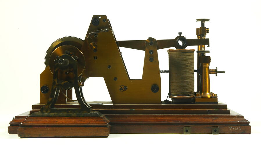 Wooden baseboard on which is mounted brass baseplate. Two vertical coils at one end of baseplate. Gear mechanism and embossing mechanism mounted between two brass frames. Arm with spindle to hold reel of paper tape missing. Various terminals for wire connections.