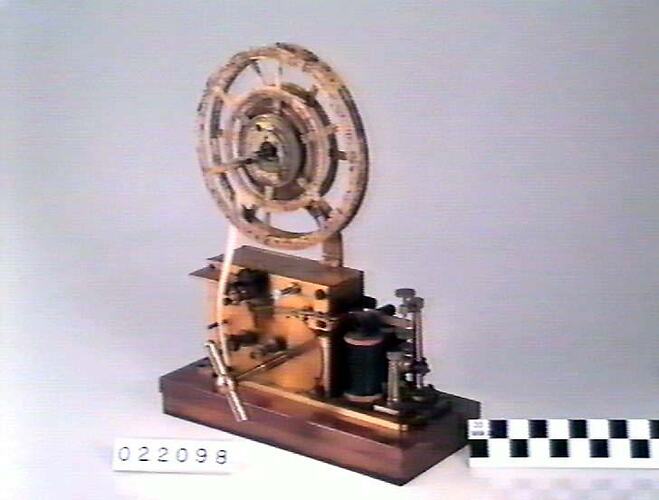 Object consists of a metal base at one end of which are two vertical wire coils forming electromagnets which are energised by the electrical signal received over the telegraph line. The rest of the base is occupied by a brass case housing the mechanism by which paper tape is moved past a small wheel at the end of a pivoted arm which moves in response to the electromagnets. The wheel is partially immersed in ink held in a small rectangular container, so that when the wheel is in contact with the tape, ink is carried on to the tape as the wheel rotates. The tape is supplied from a reel mounted above the register on a metal arm. The mechanism to move the tape is powered by a spring within the brass case which can be wound up using a key on a central square shaft.