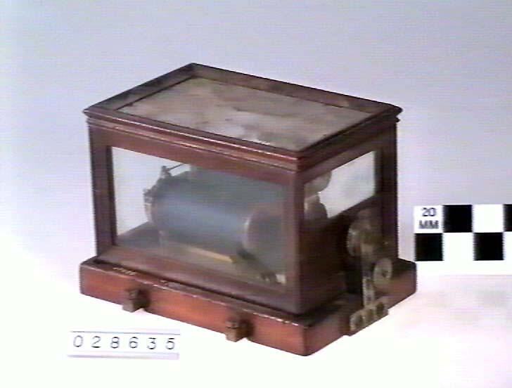 Brass baseplate on wooden base carries two horizontal coils. Brass components and screws. Four brass terminals, two on each side of wooden base. Fitted with wooden-framed glass cover.