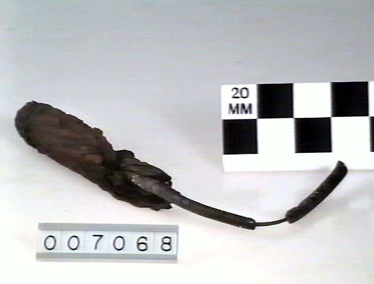 Cable has a stranded central conductor, covered with a layer of insulation. The insulation is covered by two layers of fibrous material (probably hemp), in strands of about 5 mm diameter. The two layers are laid in opposite directions. The outer layer of fibrous material carries the imprints of possibly 12 armouring wires, each wire of about 6 -- 8 mm diameter. The covering of fibrous material is missing from about half the length of the cable sample. A short length of insulation is missing from the conductor.