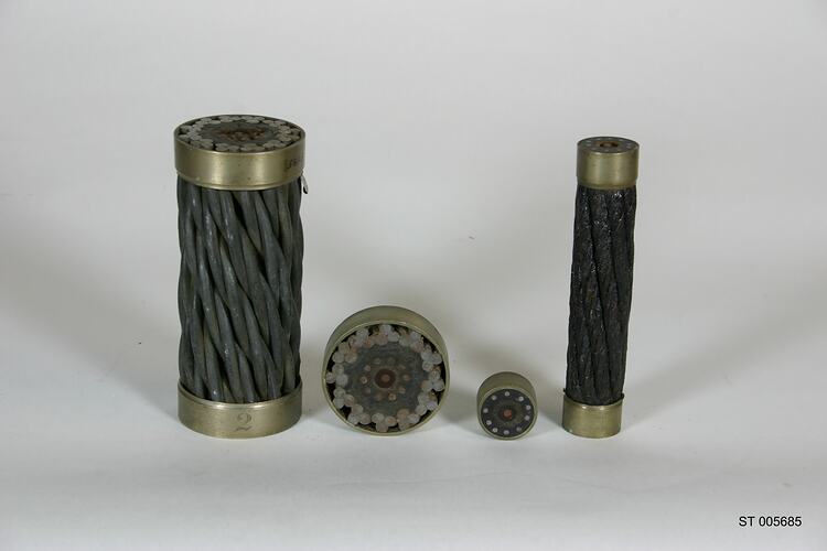 The four objects include two sections of the main cable and two sections of the shore end of the cable. The shore end is more heavily armoured than the main cable because of the greater possibility of damage close to shore by, for example, wave action or anchors. The cable consisted of a central conductor surrounded by a layer of insulation and an outer protective covering of armouring wires.