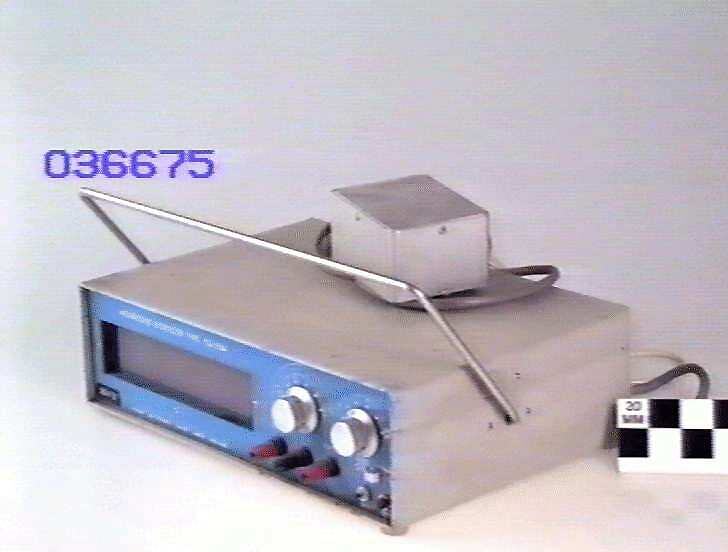 Glass encased quartz crystal oscillator. Incandescent globe/projected numerals as digital display. In metal instrument case with carrying handle. Uses discrete transistor technology on circuit boards.