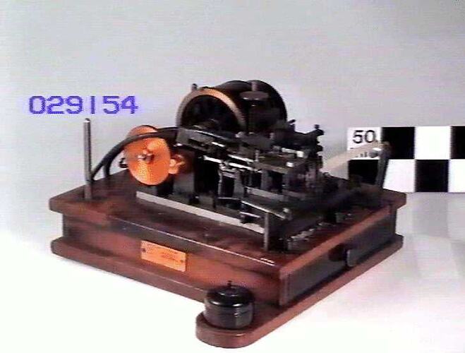 Device used to receive signals in an electric telegraph system. Pulses of electrical current representing letters and numbers according to a defined code were received from the transmitting station. This device converted the current pulses into a pattern of perforations on a continuous paper tape. The tape could then be fed into a printer which printed out the message as letters and numbers.