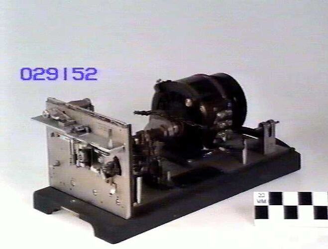 Metal base carrying metal baseplate with vertical metal endplate. Electric motor attached to baseplate. Endplate carries tape-reading mechanism. Attached connecting cable and plug.