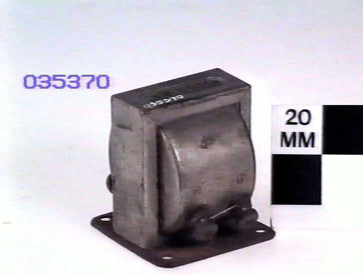 Nickel plated cylinder mounted in rectangular frame, mounted on a steel base. Four labelled terminals, two on each side.