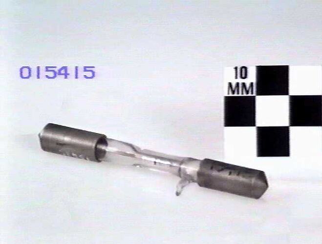Consists of evacuated clear glass tube with internal electrodes, possibly aluminium and silver, with gold filings between. End caps of metal. Glass tube has a pinch off leg extending from one side. This object is physically attached by two fine twisted wires to a display board on which a Crystal Detector (ST 21766) is also mounted.