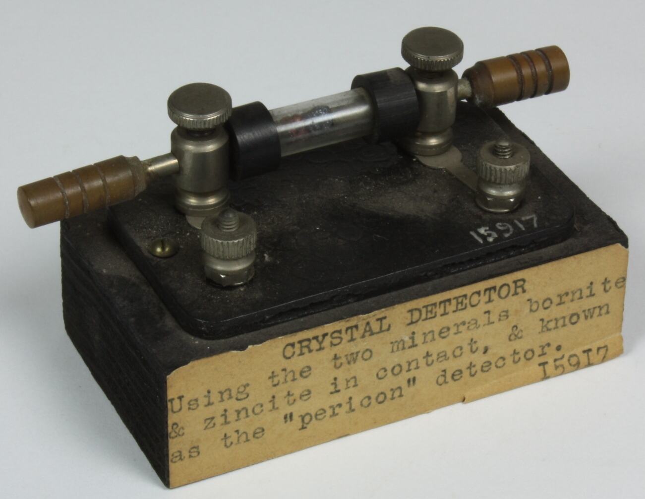 Display block: CRYSTAL DETECTOR / using the two minerals bornite / & zincite in contact, & known / as the "pericon" detector. Note: 'Perikon' is misspelt on label.