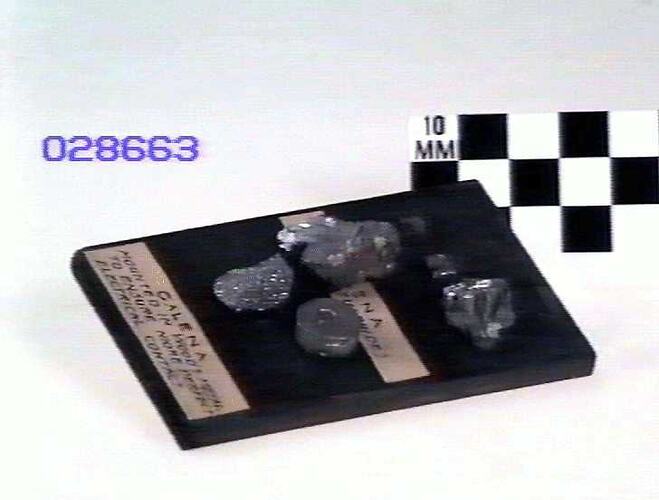 Display Board: Label One: GALENA/(LEAD SULPHIDE) Label Two: GALENA/MOUNTED IN WOOD'S METAL/TO ENSURE MORE PERFECT/ELECTRICAL CONTACT
