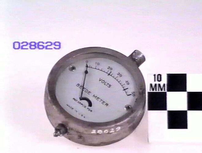 Dial: VOLTS / BEEDE METER / PAT. APPL'D FOR / MADE IN U.S.A. Scale marked in 10 V steps to 50 V Scale is highlighted at 22.5 and 45 V Scratched on back: 200