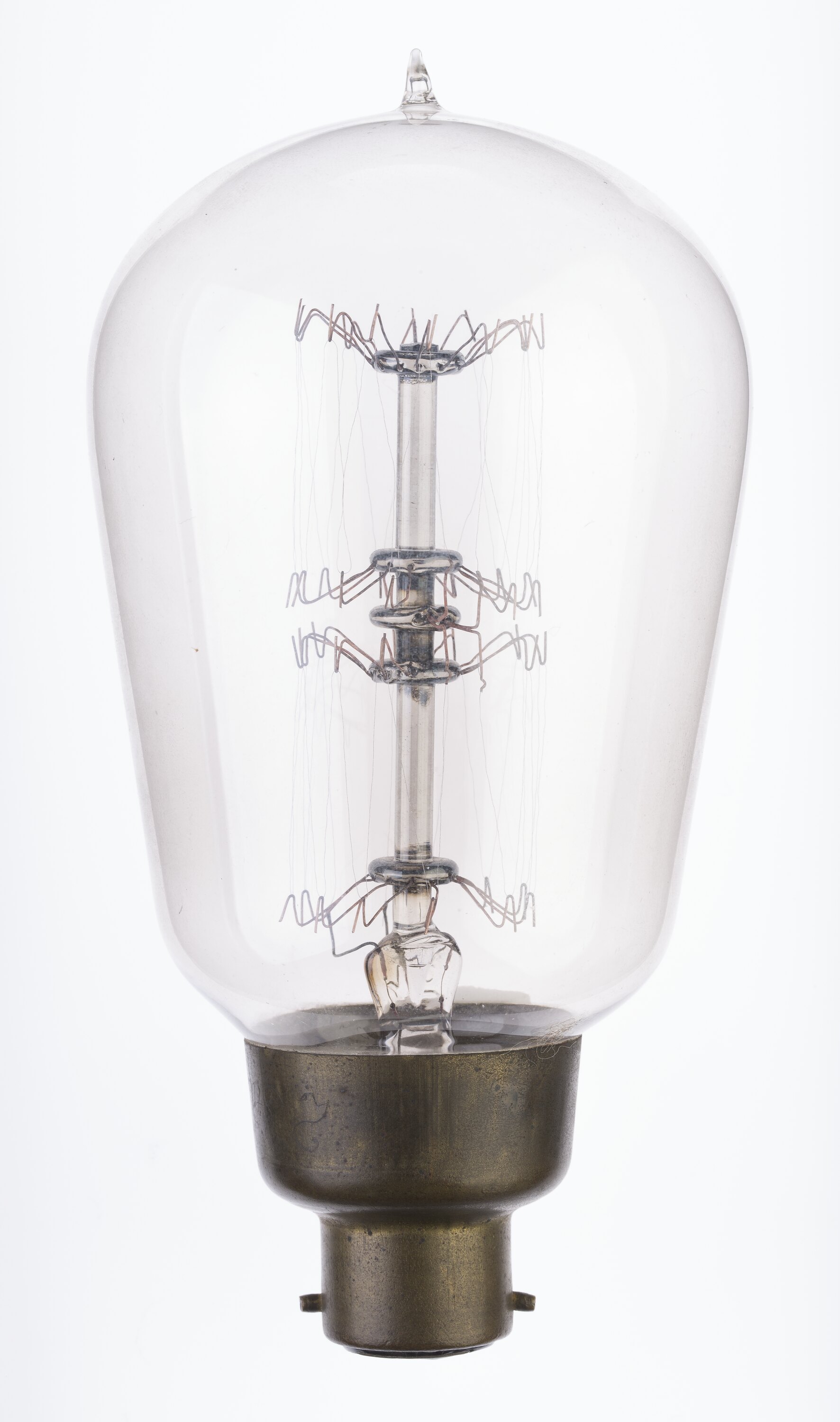 240 mm (9.5 inch) circumference glass globe. Straight tantalum filament, zig-zagged circumferentially between 12 wire supports in a double 'squirrel cage' arrangement. Exhausted at top of globe. Brass bayonet cap. Double pin contact.