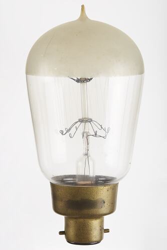 115 Volt, straight tungsten filament, electric lamp. Made by Siemens Brothers Dynamo Works Ltd, in Dalston, London, England from 1910.