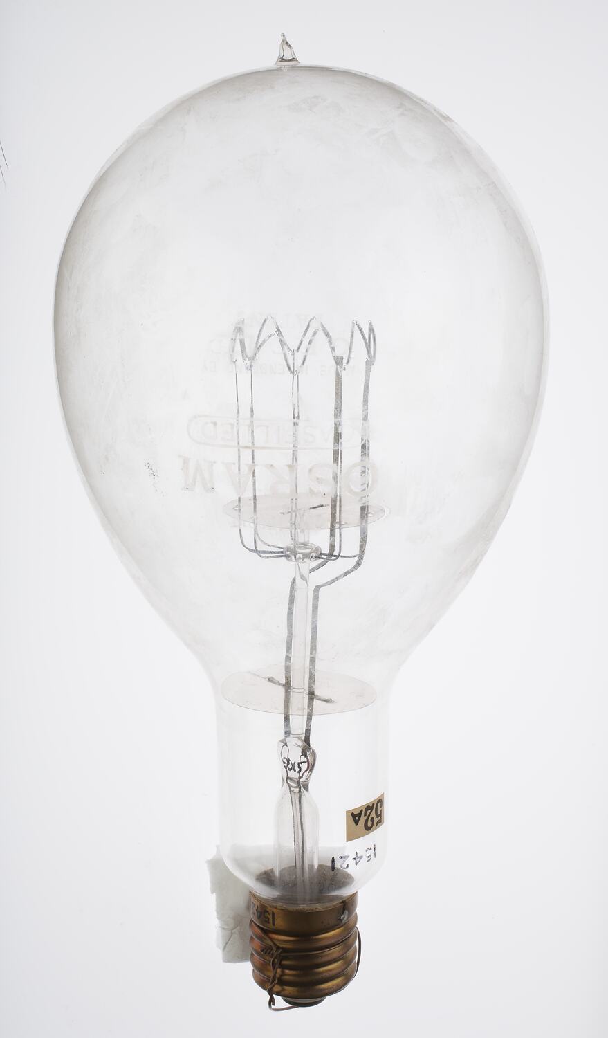 The name 'Osram' was trademarked in 1906 and is a contraction of osmium and wolfram (also known as tungsten). These two elements were used in the manufacture of the metal filaments for early electric lamps. In 1913, Irving Langmuir discovered that inert gas filled globes were more luminous and reduced blackening of the inside of the globe.