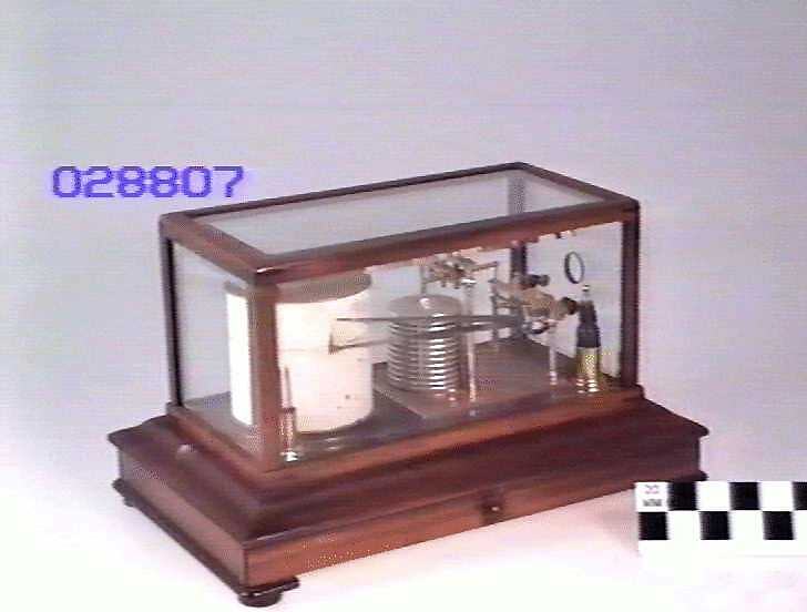 Barograph sits on top of a wooden plinth and is covered by a glass and wooden case. All wooden components are varnished hardwood. Wooden plinth contains a drawer and is rectangular with four bun feet and panels on the short side. The drawer is partioned into two parts The front section contains unused paper charts, a piece of scrap paper with annotations in red ball-point ink, a plastic pen and spare part. The back section contains used charts. The barograph consists of a recording pen, pen and pair of arms, metal barometric coil as well as the transfer mechanisms, translating the movement of the coil to the pen arm. All components except the drum are mounted on a gold coloured base plate. Additionally, there are two metal wells holding bottles of ink (one brown, one blue). There is a used chart mounted n the drum, dated 26/7/76. There is a spare pen nib resting on the metal base plate. The case has a wooden frame, with the five sides enclosing bevelled glass panels. The glass has a large circular hole to allow access to adjustment mechanisms on the instrument.