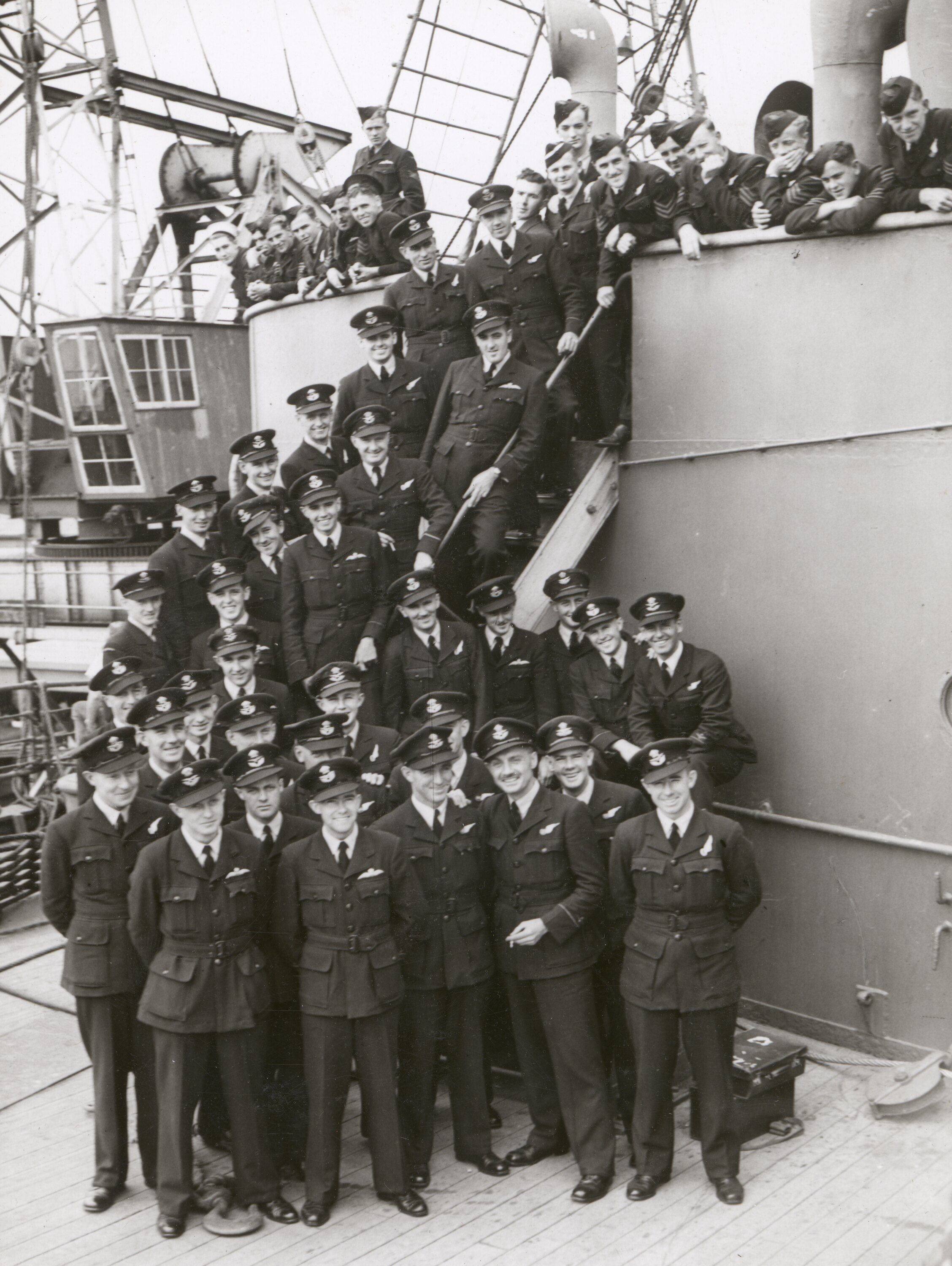 Group of RAAF officers and men plus two sailors, all in uniform, on board an unidentified ship.