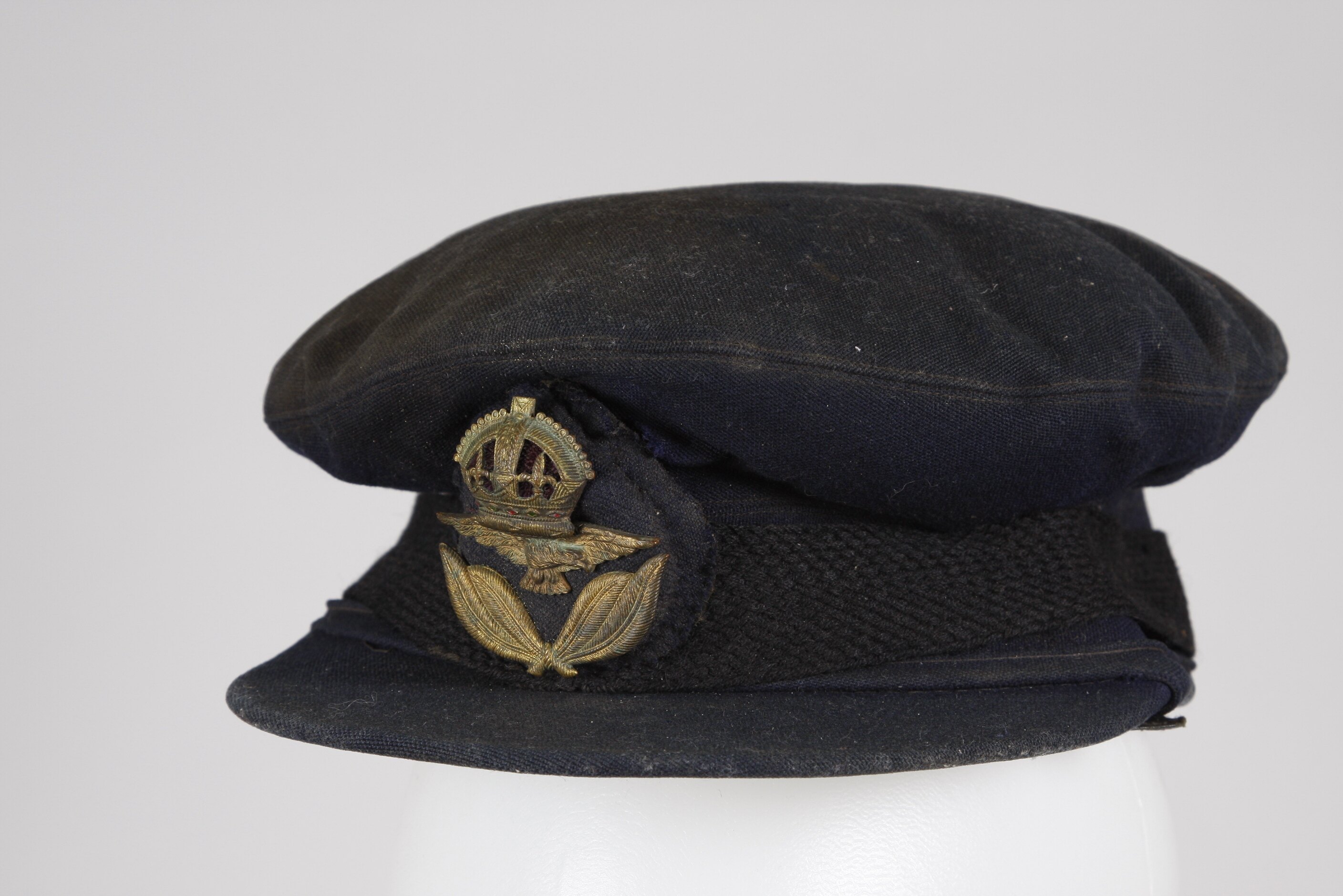 World War II RAAF officer's peaked cap with gold braid insignia. Chin strap and side buttons missing.