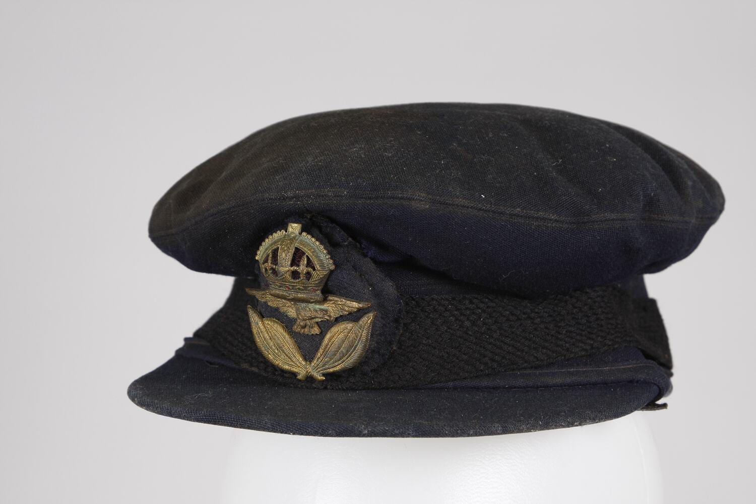 Navy peaked cap with gold braid insignia on centre front. Chin strap and side buttons missing. Dark brown patch of soiling on top right side.