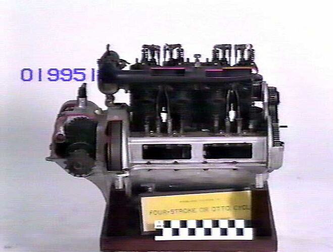 Henderson four-cylinder engine from a Model Z motor cycle, purchased by the Museum in 1935 from Mr A. Burns of Collins Street, Essendon. It was sectioned for display at a later date.