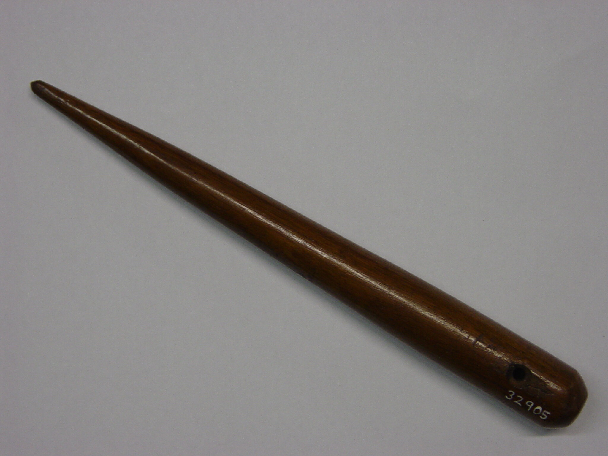 Constructed from a rod of wood, circular at one end, tapering to a point at the other end. The thicker end has a hole horizontally through the rod. Spike has a varnish coating.