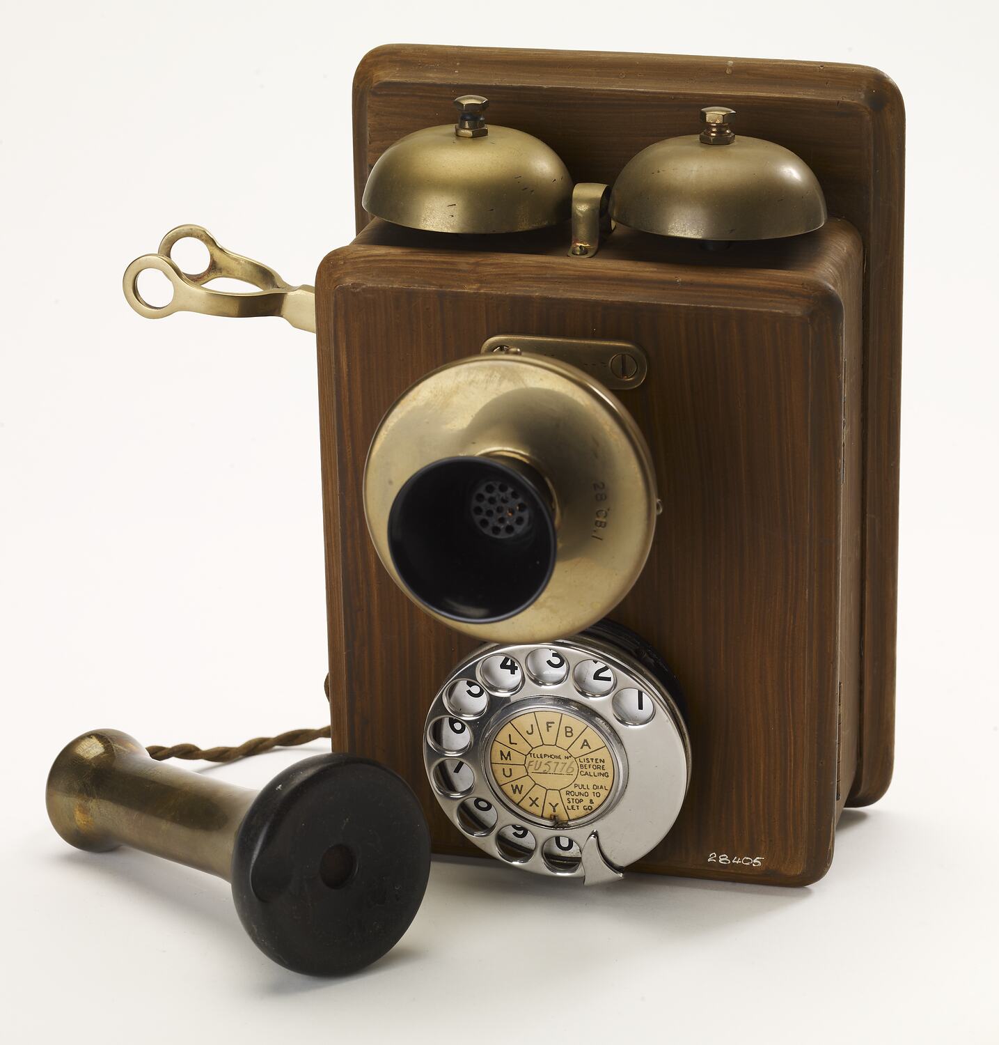Small wall mounted telephone manufactured about 1920. Brassware has been polished and set painted to make wood grain effect.