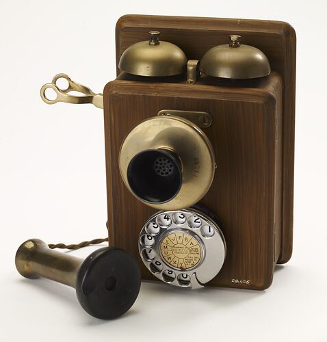 Wooden box painted to give wood grain effect with two brass bells on top, brass handset on the left hand side with a textile cord and a brass receiver on the front with silver metal dial below. Inside wooden box (hinged right hand side) contains electrical wires and components. Hole for hanging unit on back in centre with four circular wooden feet around.