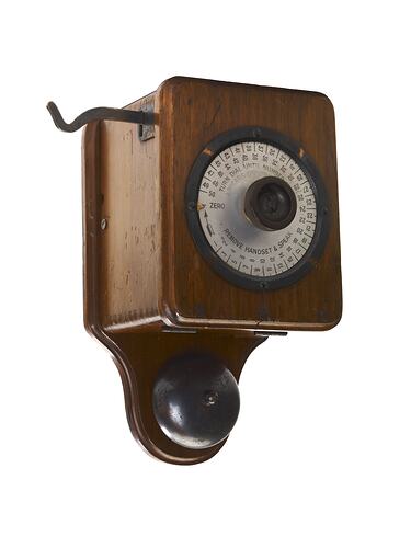 Wall telephone manufactured by the Telephone Manufacturing Company Ltd (TMC), circa 1925. The dial was required to be set first to the number required, when the action in removing the handset from the hook allowed the dial to commence rotating. As each line had a selector permanently attached there was no necessity for time before dialling for any pre-switching purposes.