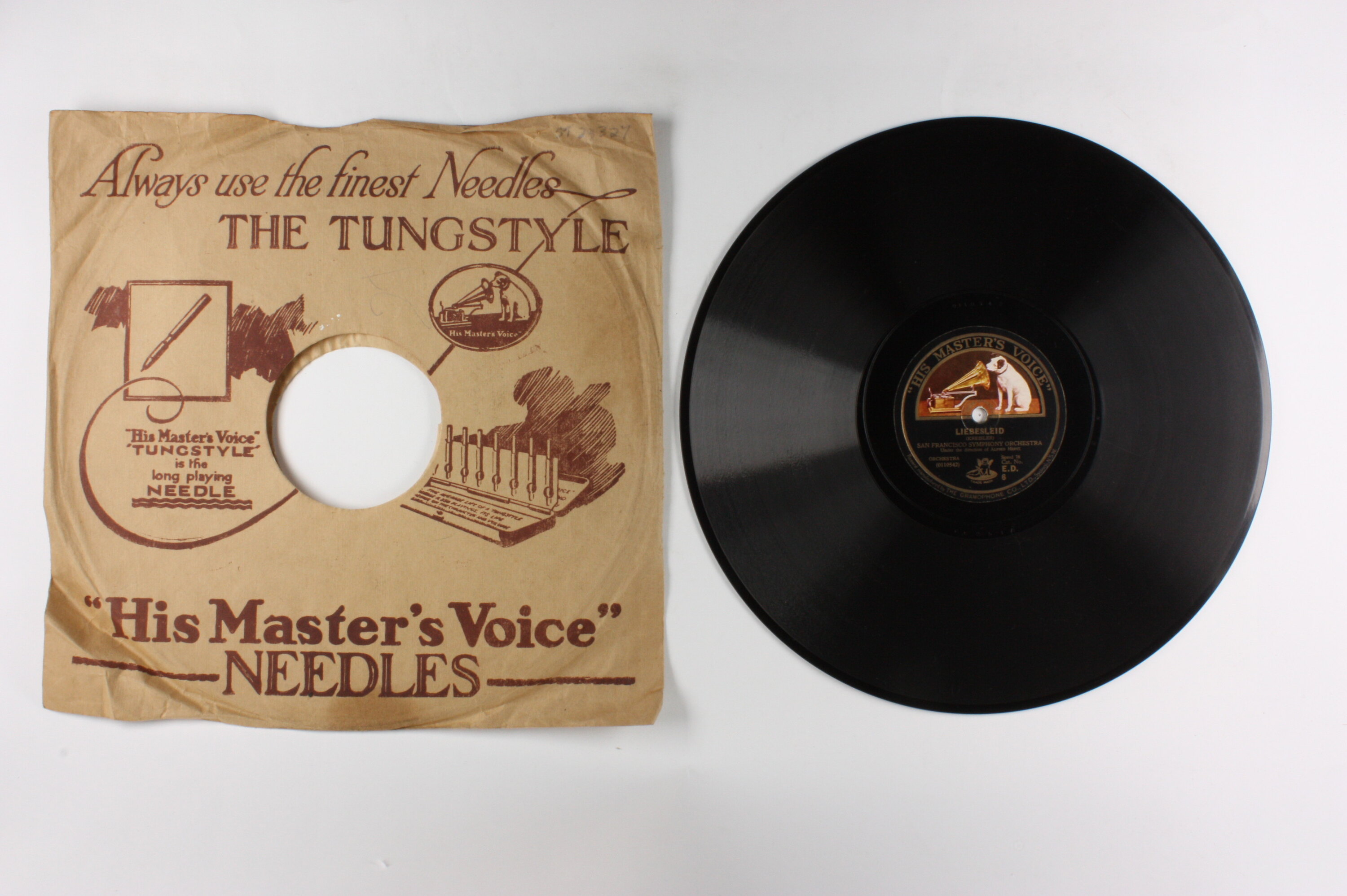 TYPE: HIS MASTER'S VOICE 12 IN. CONTENTS:"SERENADE" AND "AUBADE", PLAYED BY THE SAN FRANCISCO SYMPHONY ORCHESTRA CONDUCTED BY ALFRED HERTZ. COMPANY: TYPE DETAILS: DOUBLE SIDED. BLACK LABEL. COMMENTS: CAT. NO. ED 6. CARD SAYS "LIEBESLEID 0110542".