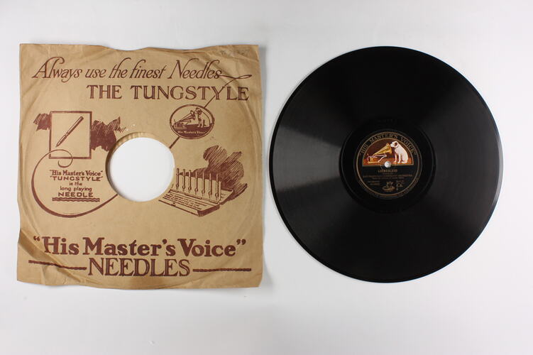 Side A: "HIS MASTER'S VOICE" / (illustration) / LIEBSLEID / (KREISLER) / SAN FRANCISCO SYMPHONY ORCHESTRA / Under the direction of ALFRED HERTZ / Orchestra (0110542) / (illustration) / Speed 78 Cat. No. E.D. 6 / Record manufactured by THE GRAMOPHONE CO. LTD., Sydney, N.S.W Side B: "HIS MASTER'S VOICE" / (illustration) / (a) SERENADE (Moszkowski) (b) Aubade (Auber) / SAN FRANCISCO SYMPHONY ORCHESTRA / Under the direction of ALFRED HERTZ / Orchestra (0110543) / (illustration) / Speed 78 Cat. No. E.D. 6 / Record manufactured by THE GRAMOPHONE CO. LTD., Sydney, N.S.W One side of sleeve: "His Master's Voice" / (illustration) / (text) Second side of sleeve: (text) / (illustration) / (text)