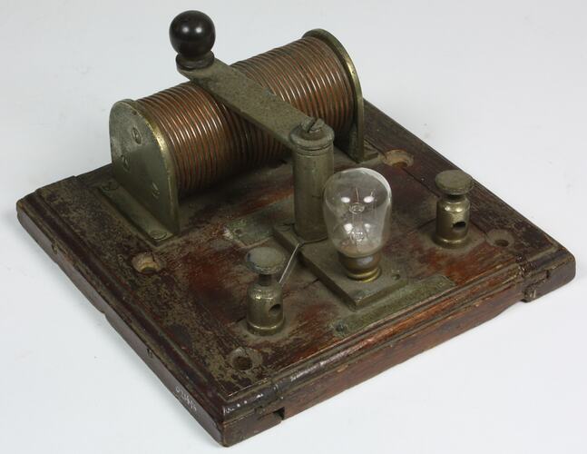 Wooden baseboard with two terminals and a lamp in a socket. A moveable arm connects the lamp to a slide contact on a coil.