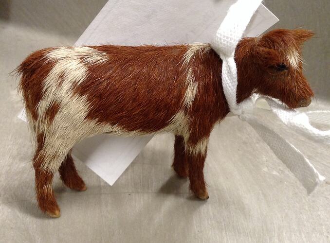 The model consists of a paper mache armature, shaped with bees wax, and red and white coat consisting of cow hair. The eyes are probably made of glass, with ears & hooves of wood. Horns are made from real horn whittled down to size. Scale approx. 1:22. [To be confirmed]