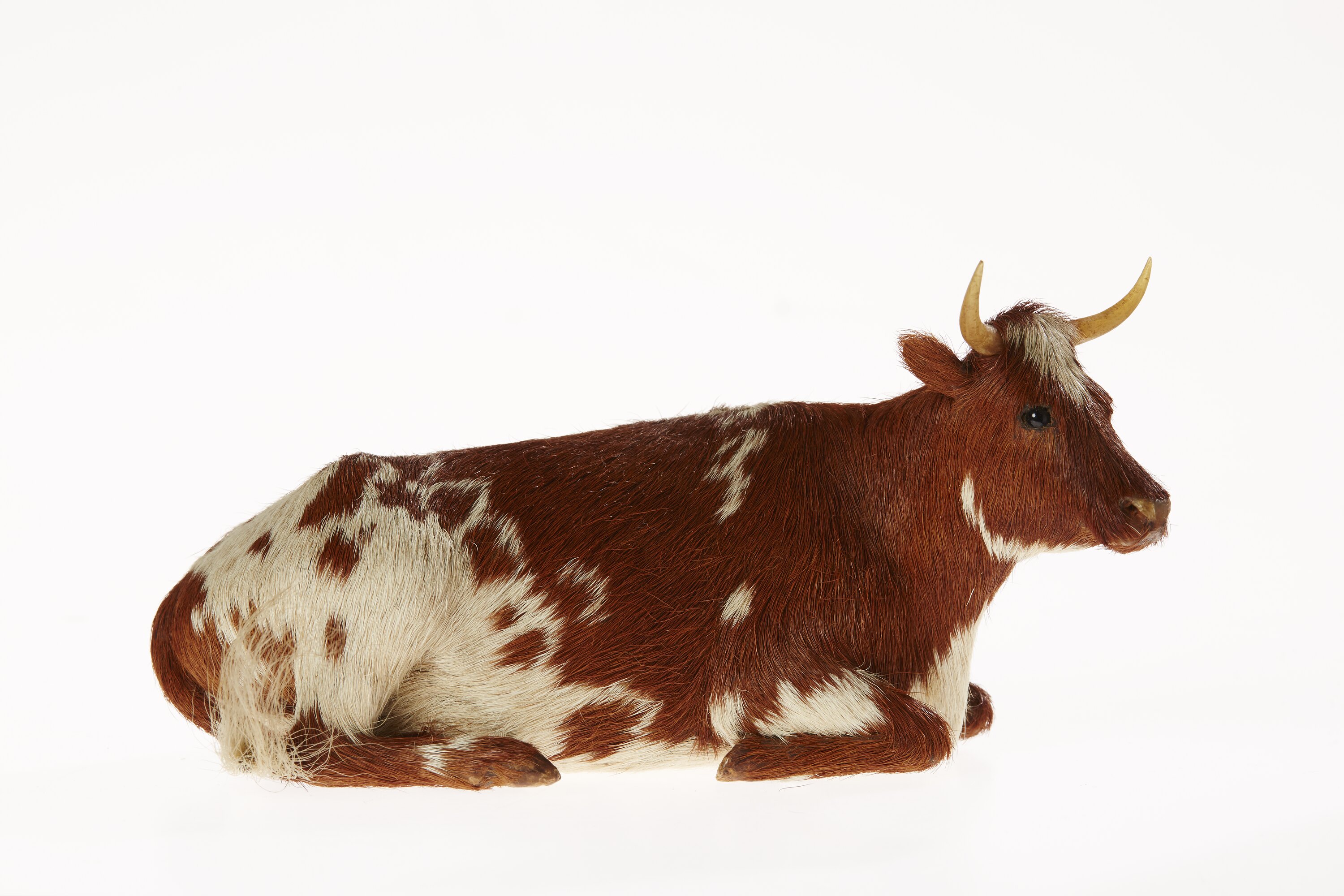 Model of seated cow, brown and white, with horns. The model consists of a paper mache armature, shaped with beeswax, and red and white coat consisting of cow hair. The eyes are probably made of glass, with ears & hooves of wood. Horns are made from real horn whittled down to size. Scale approx. 1:12. [This needs to be confirmed.]