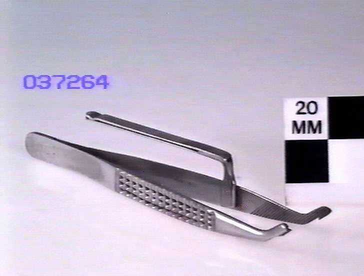 Metal tweezer-like forceps with sharp teeth on the edges.