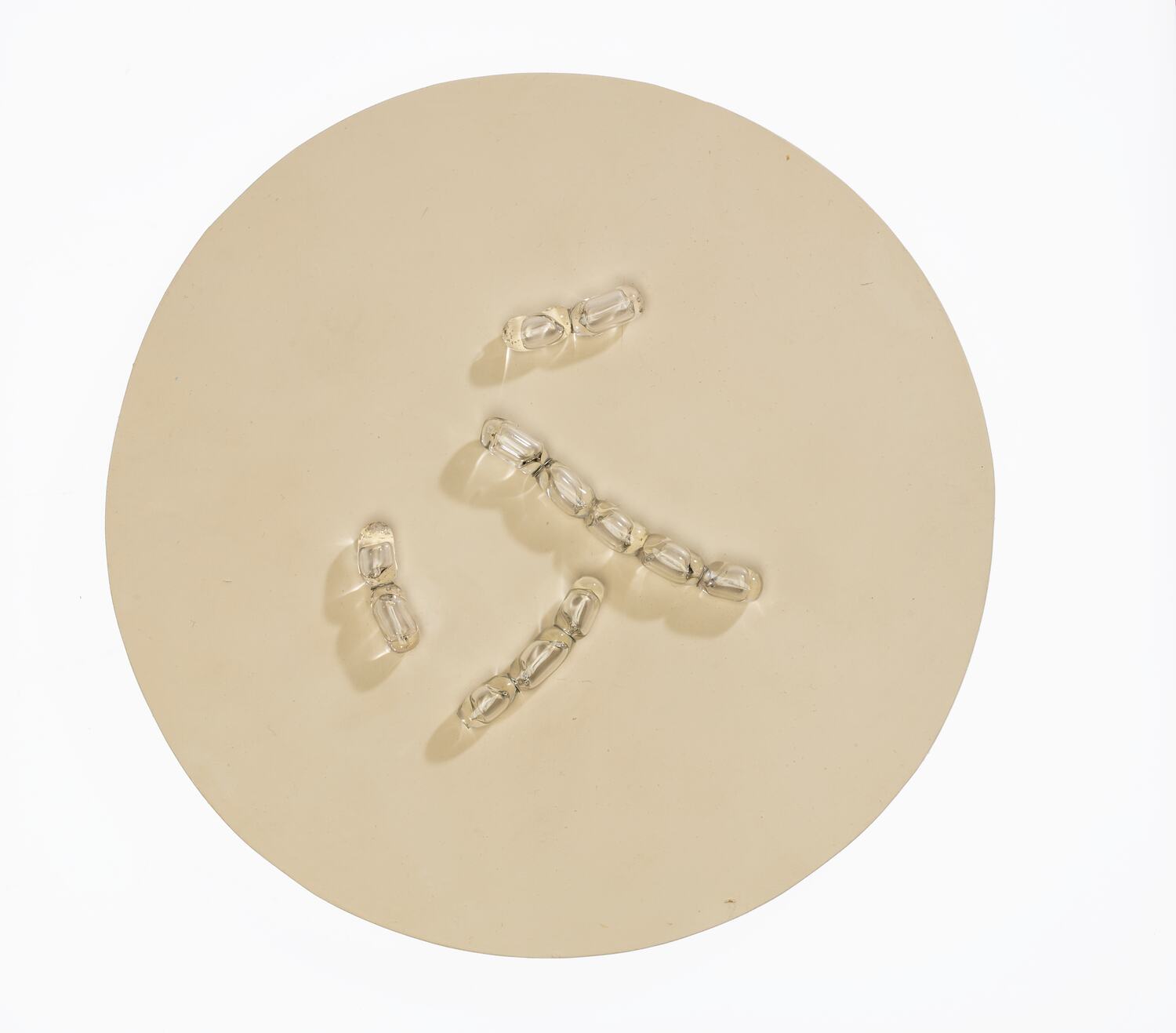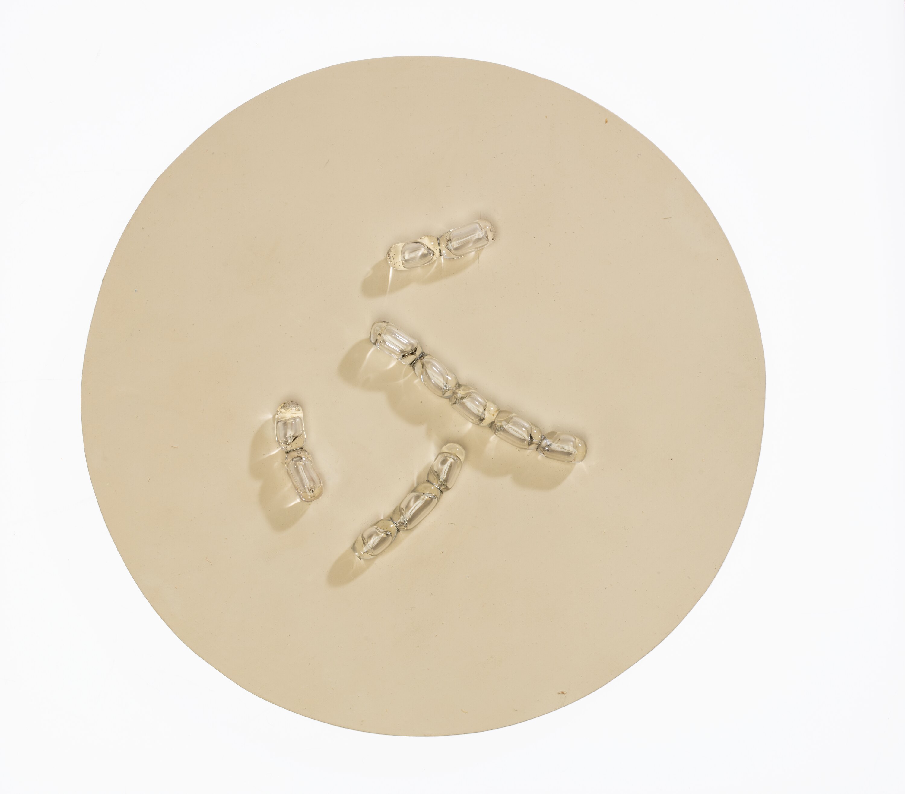 4 clear glass tubes attached to a beige wooden circle with metal wire.