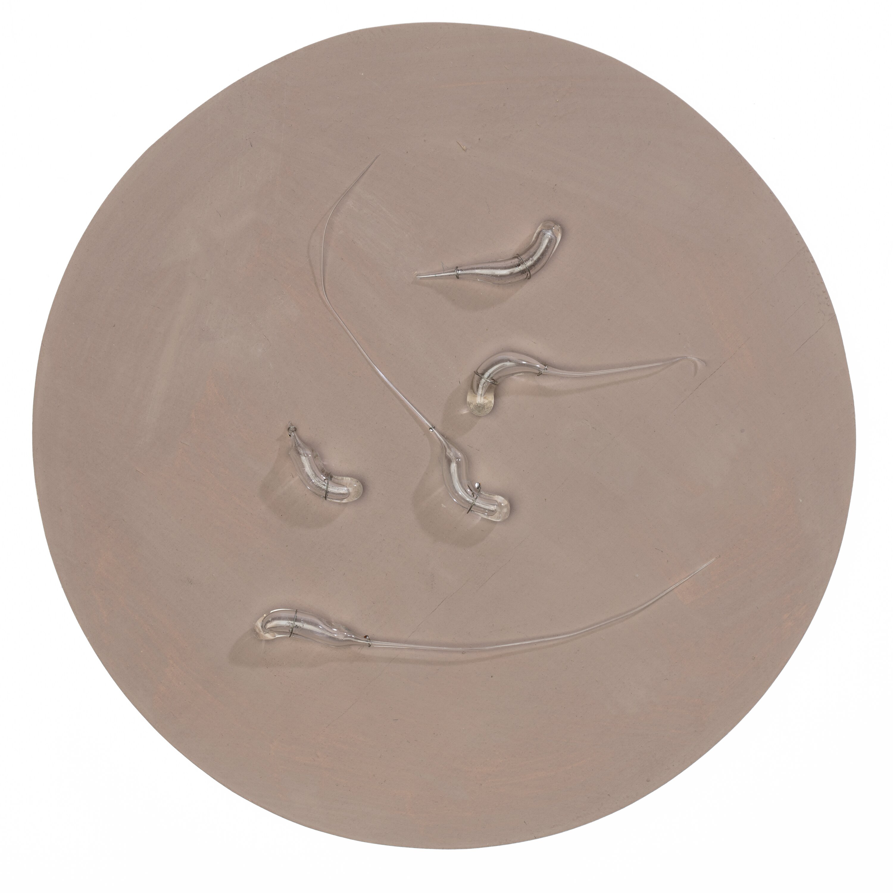 5 clear glass comma shaped tubes with long tails attached to a light puce wooden circle with metal wire.