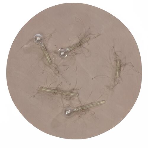 Five clear glass tubes (three with bulbed end) with curly hairs attached to a light puce wooden circle with metal wire.