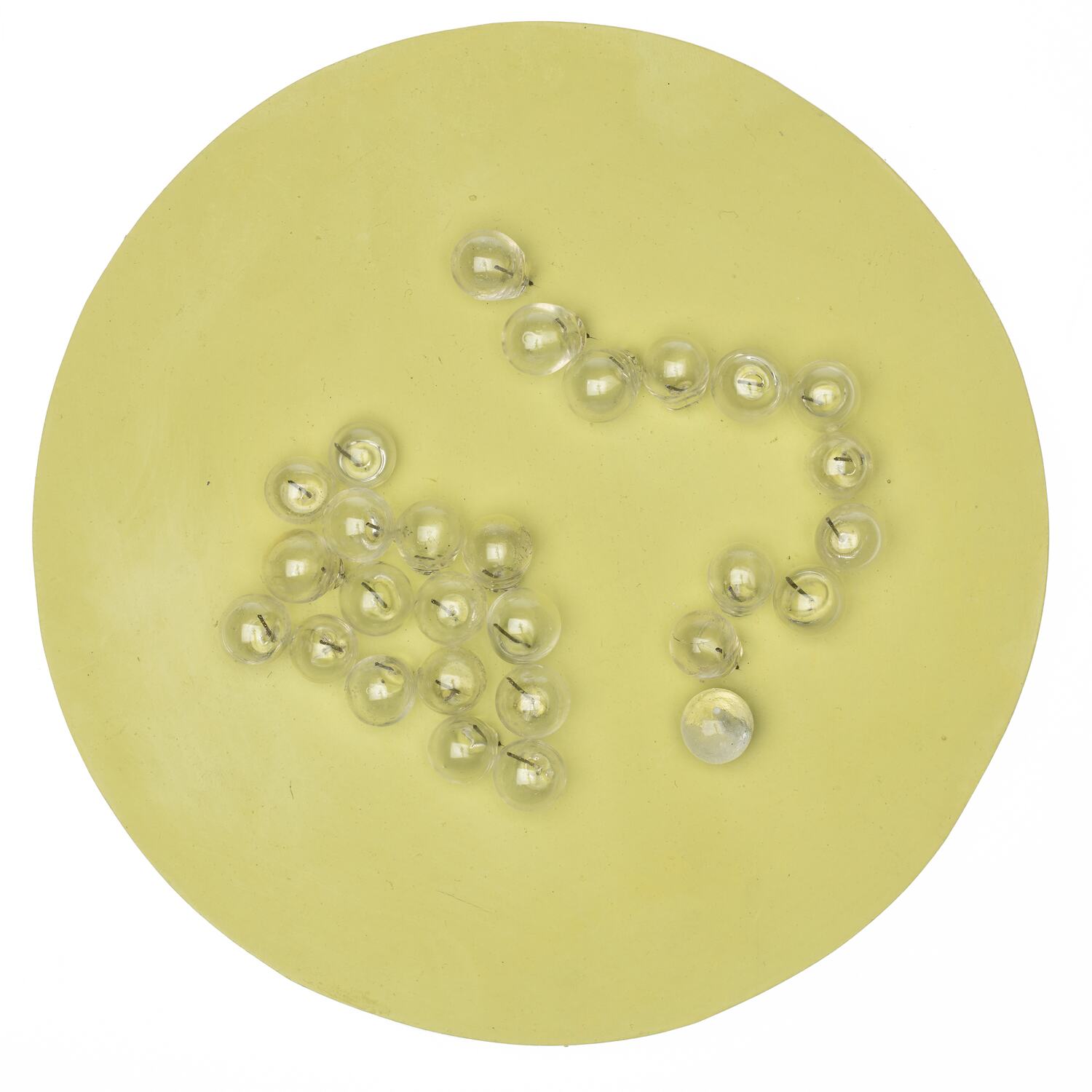 12 clear glass balls in a chain attached to a pale green wooden circle with metal wire, along with a representation of Micrococcus Pyogenes.