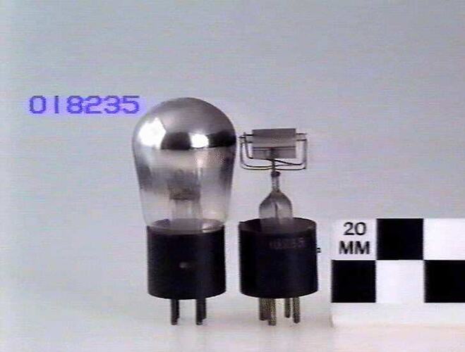 Conical glass bulb with American style 4 pin (UX) base mounted on display block with a similar valve showing the internal elements with bulb removed; showing a horizontal structure.