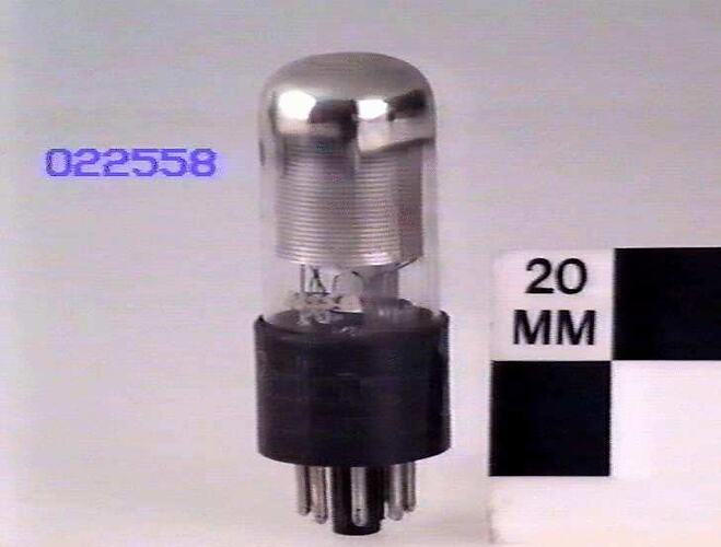 High gain pentode originally designed for use in television receivers and adopted for use in radar and other military applications during World War Two (1939-1945). Normally made with a metal bulb but AWV was not equipped for metal valve production so they produced this version with a glass bulb. 6.3 volt indirectly heated cathode.